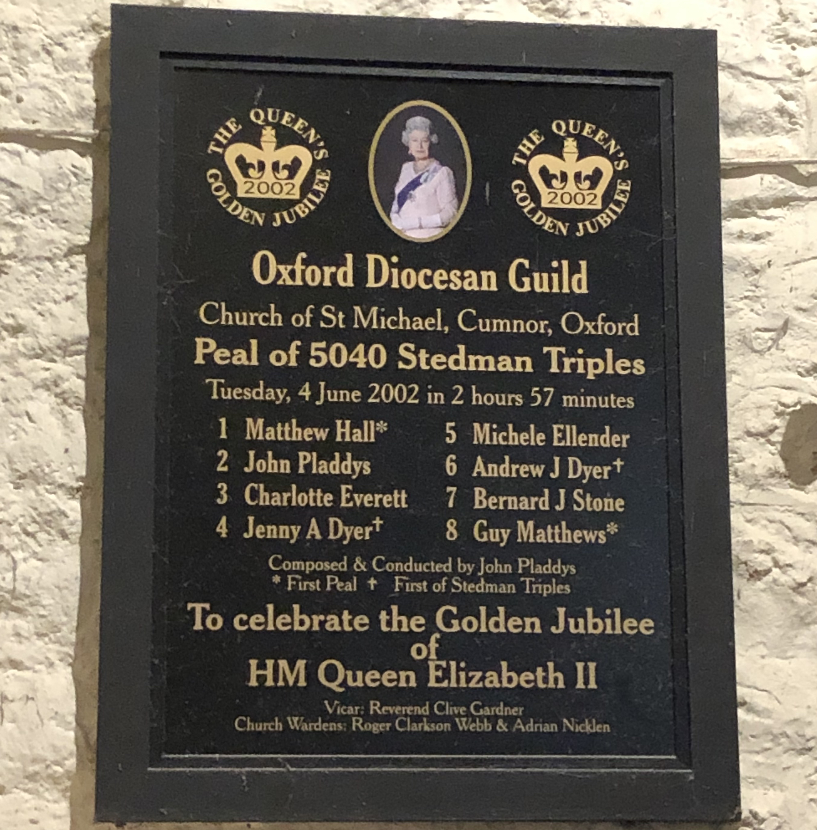 We sometimes ring quarter peals to honour specific local people, and full peals to mark significant national events such as the Golden, Diamond and Platinum Jubilees of Queen Elizabeth II in 2002, 2012 and 2022.